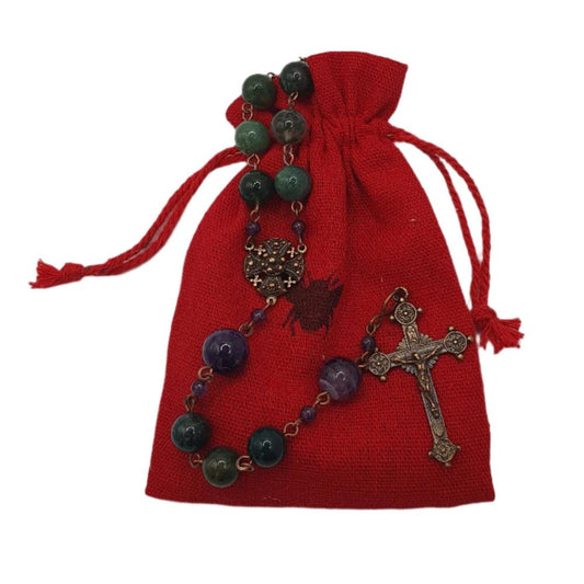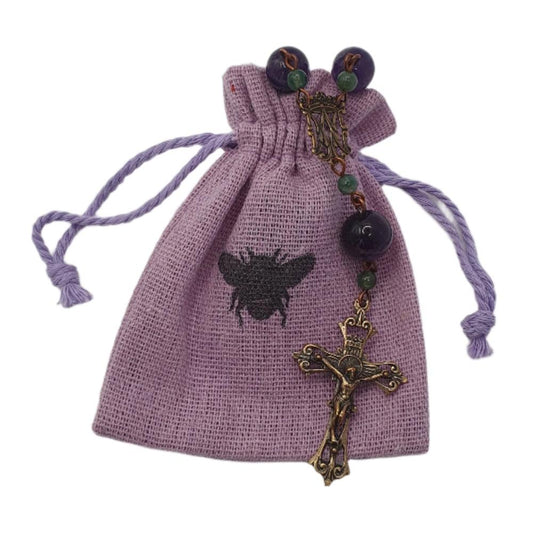 Handmade Sage Amethyst and Moss Agate Pocket Rosary with Bronze Filigree Crucifix