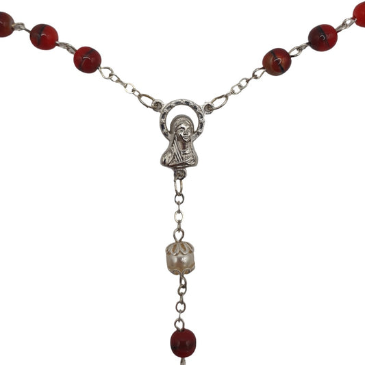 Red Marble Effect Rosary with Imitation Pearls and Mary Centrepiece