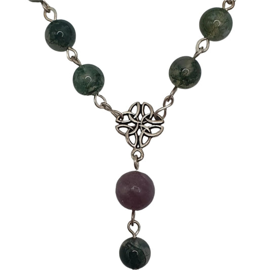 Handmade Moss Agate & Plum Jade Five-Decade Rosary – Celtic-Inspired Artisan Design